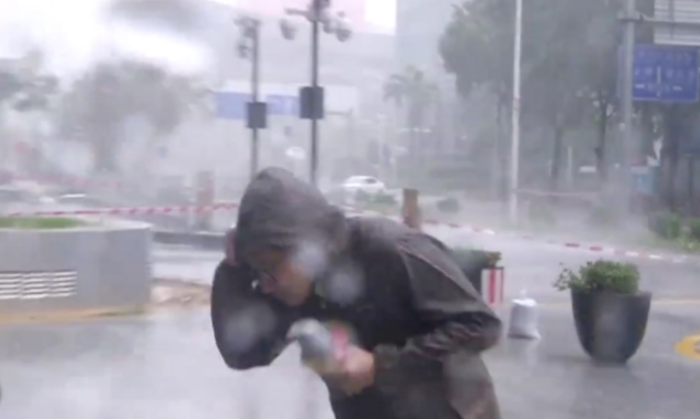 Phóng viên đưa tin về cơn bão Mangkhut ở Trung Quốc ngày 16/9. Video: CGTN .