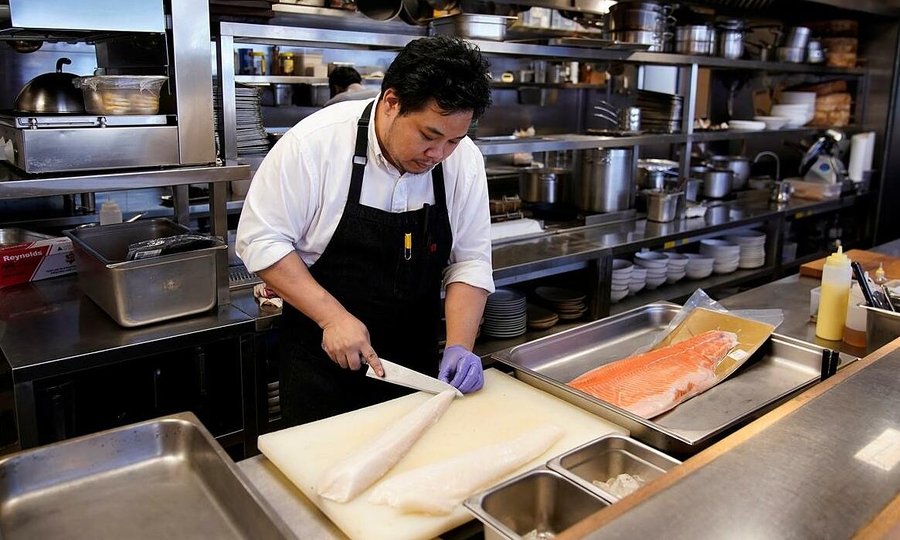 Austin Hu, chủ sở hữu, bếp trưởng của nhà hàng cao cấp Madison Shanghai Heritage, chế biến vào ngày 14 tháng 8 Cá đông lạnh. Ảnh: Reuters-Mối lo ngại ban đầu về thực phẩm đông lạnh nhập khẩu là do phát hiện nCoV trên thớt tại chợ Tampadia ở Bắc Kinh vào tháng Sáu. Thớt được sử dụng để chế biến cá hồi nhập khẩu.