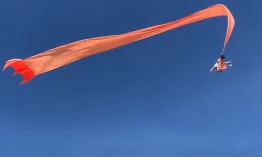 Một cơn gió mạnh đã làm xoắn đuôi con diều vài lần, khiến con diều bị lăn. Em bé nắm chặt đuôi diều, những người tham gia dưới đất hoảng sợ vội vàng giải cứu em.